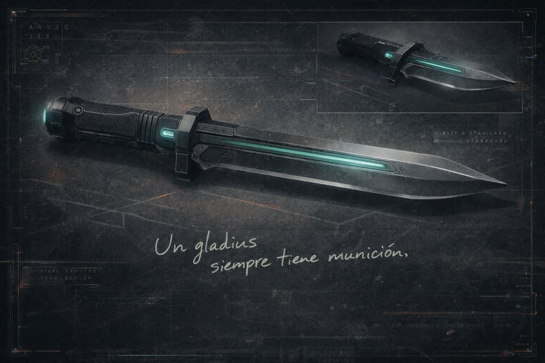 El gladius táctico es una reinterpretación moderna de la hoja que forjó imperios: corto, directo, letal. Esta versión ha sido optimizada para el combate contemporáneo, combinando una construcción robusta con aleaciones reforzadas con pharanteno, capaces de perforar blindajes ligeros y rendir armaduras en enfrentamientos cerrados.